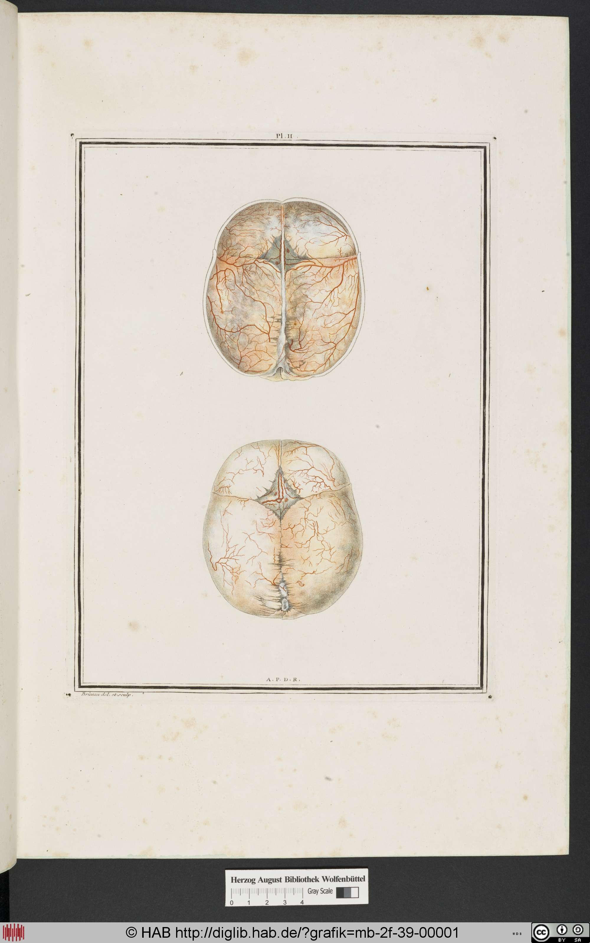 Mehrfarbendruck, in Blau, Gelb, Rot und Schwarz; siehe die vier Registerlöcher in den vier Ecken. Kopiiert nach den zwei Blätter von Jan Ladmirals mit Darstellungen des Hirnhautes, siehe die Einleitung zum Exemplar Mb 2° 39, 2. Teil (planches anatomiques), S. 3; siehe Verweis.